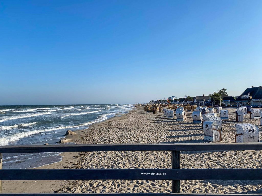 Blick von der Seebrücke aus in Richtung Süden, an diesem Tag gab es Ostwind, an dem sich kleinere Wellen gebildet hatten, bei Westwinden gibt es keine Wellen. Dann im Vordergrund das Holzgeländer der Seebrücke, links die Ostsee rechts wieder Strandkörbe und die lange Promenade mit den Geschäftshäusern. Wenn das Wetter noch etwas klarer wäre, könnte man die 2. Küstenlinie der Lübecker Bucht deutlich sehen, dort ist dann Boltenhagen, der Leuchtturm von Boltenhagen und die Insel Poel deutlich zu erkennen.