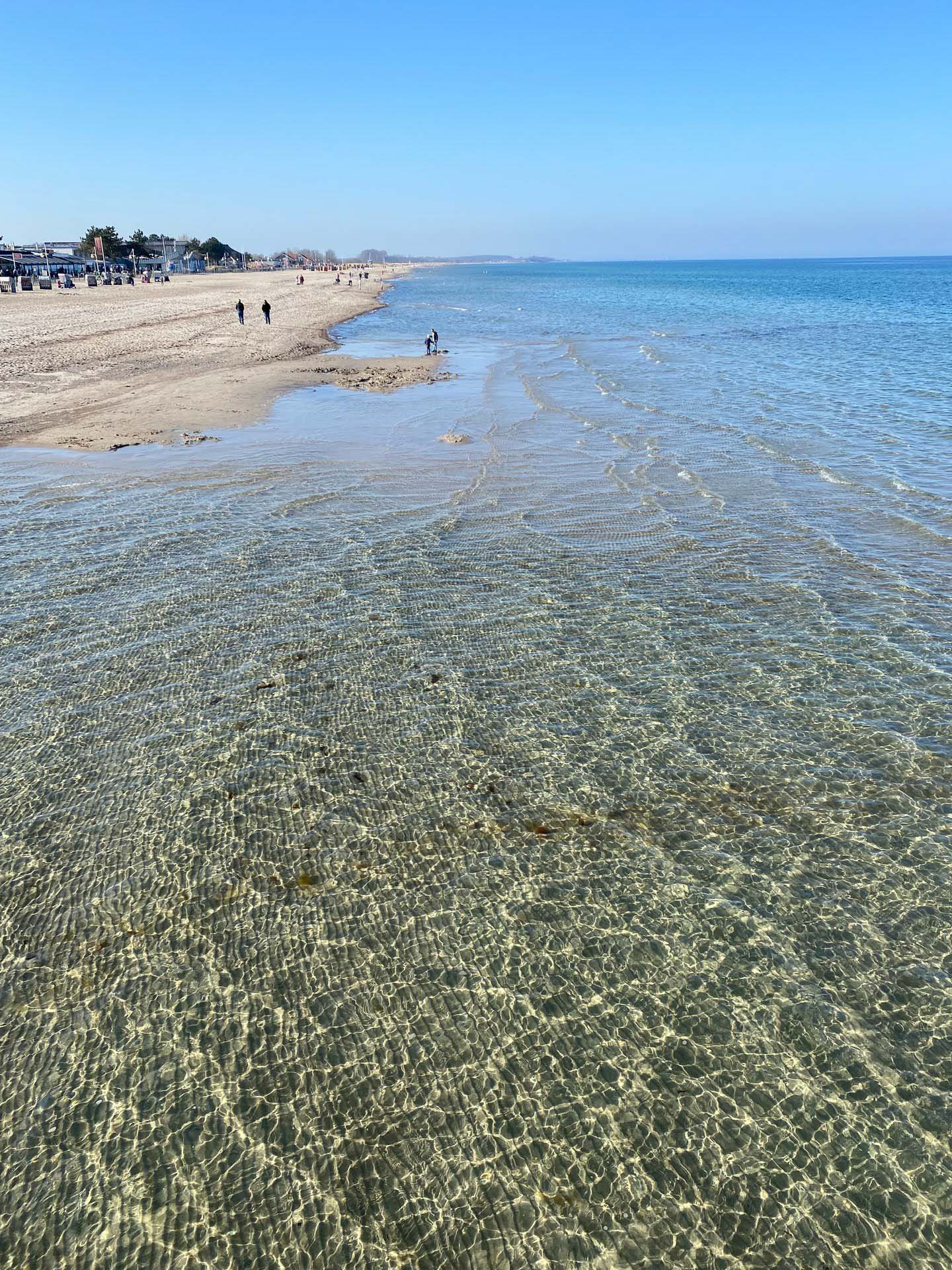 Hier ein Bild nach Norden von der Seebrücke aus fotografiert, im Vordergrund zu sehen ist das kristallklare Wasser, weiter oben sieht man links die Promenade mit den Geschäftshäusern in denen Restaurants, Cafés, Souvenirgeschäfte, Konditorei, Strandkorbvermieter und Modegeschäfte ansässig sind. Bei ganz klarem Wetter wäre oben rechts dann die Insel Fehmarn mit der Fehmarnsundbrücke und auch Dänemark zu erkennen.